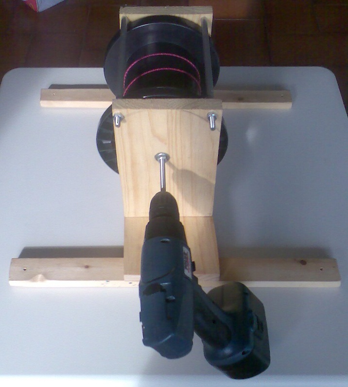 La perceuse est fixée sur l'axe, et le tour est joué.